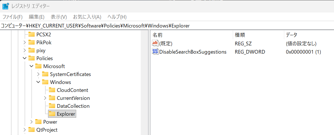 Exploerの中で右クリックメニュー「新規→DWORD(32ビット)値」を選択名前: DisableSearchBoxSuggestions